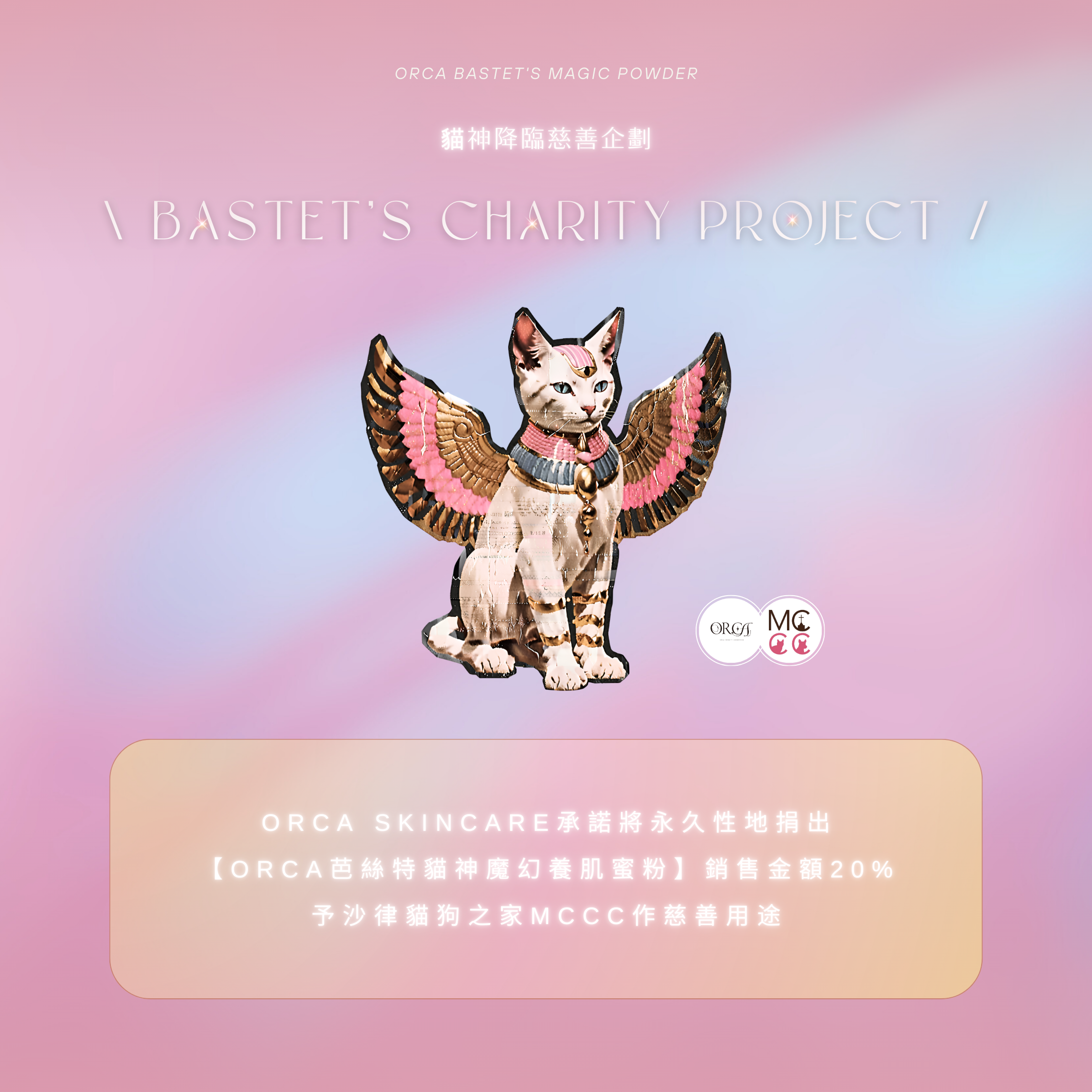Orca Skincare 將會永久性地把【ORCA芭絲特貓神魔幻養肌蜜粉】銷售金額的20%,以每月月結的轉賬形式捐贈予MCCC沙律貓狗之家作慈善用途